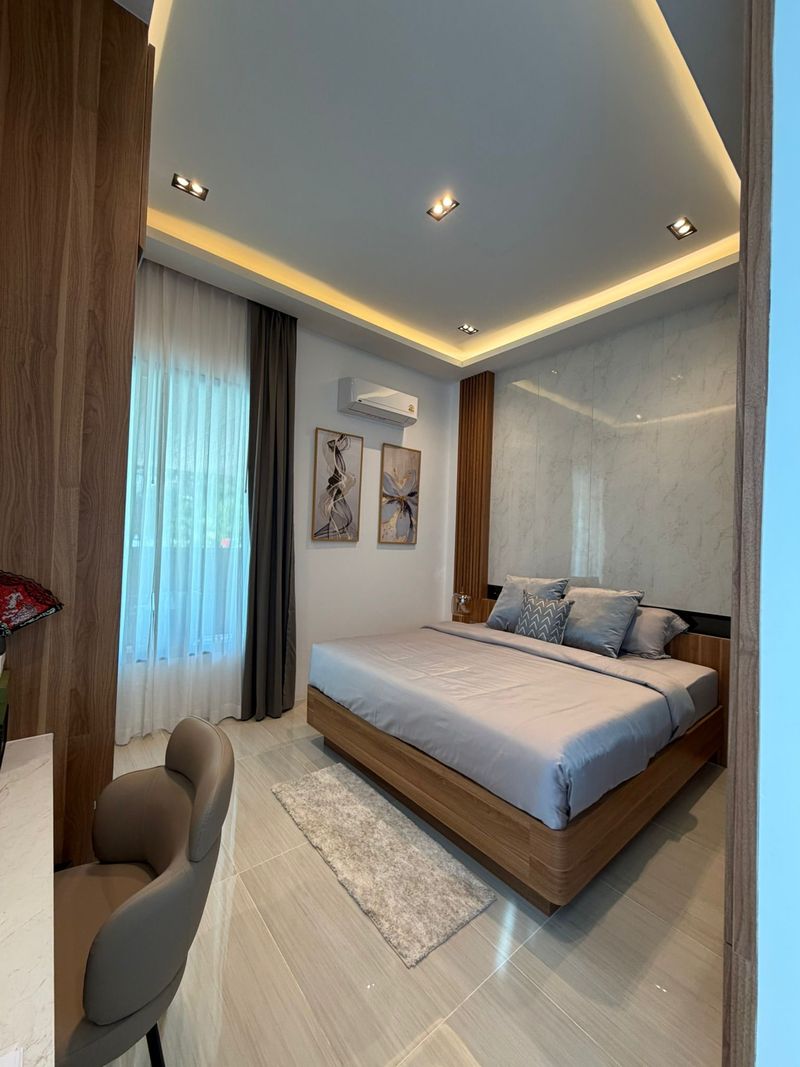 165 м² застройки, участок 198–260 м², 3 спальни, 3 ванные комнаты, собственный бассейн 3,5 × 8 м и крытая парковка. Архитектура выполнена в современном тропическом стиле: натуральные текстуры, тёплые оттенки, панорамные окна и гармоничное соединение внутреннего и внешнего пространства. Дом создаёт ощущение уединённого курорта — без шума и плотной застройки.